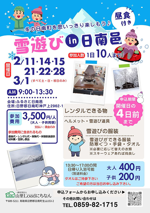 参加ご希望の方は「一般社団法人山里Loadにちなん」お電話(0859-82-1715)またはこちらの申込先フォームよりお申込みください。